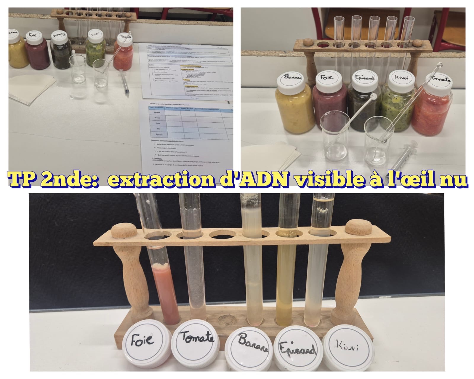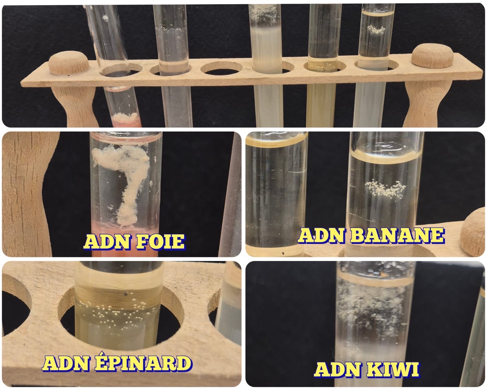Les élèves de Seconde ont réalisé une expérience fascinante : l’extraction d’ADN observable à l’œil nu 🧪✨, à partir de foie, de fruits et de légumes.